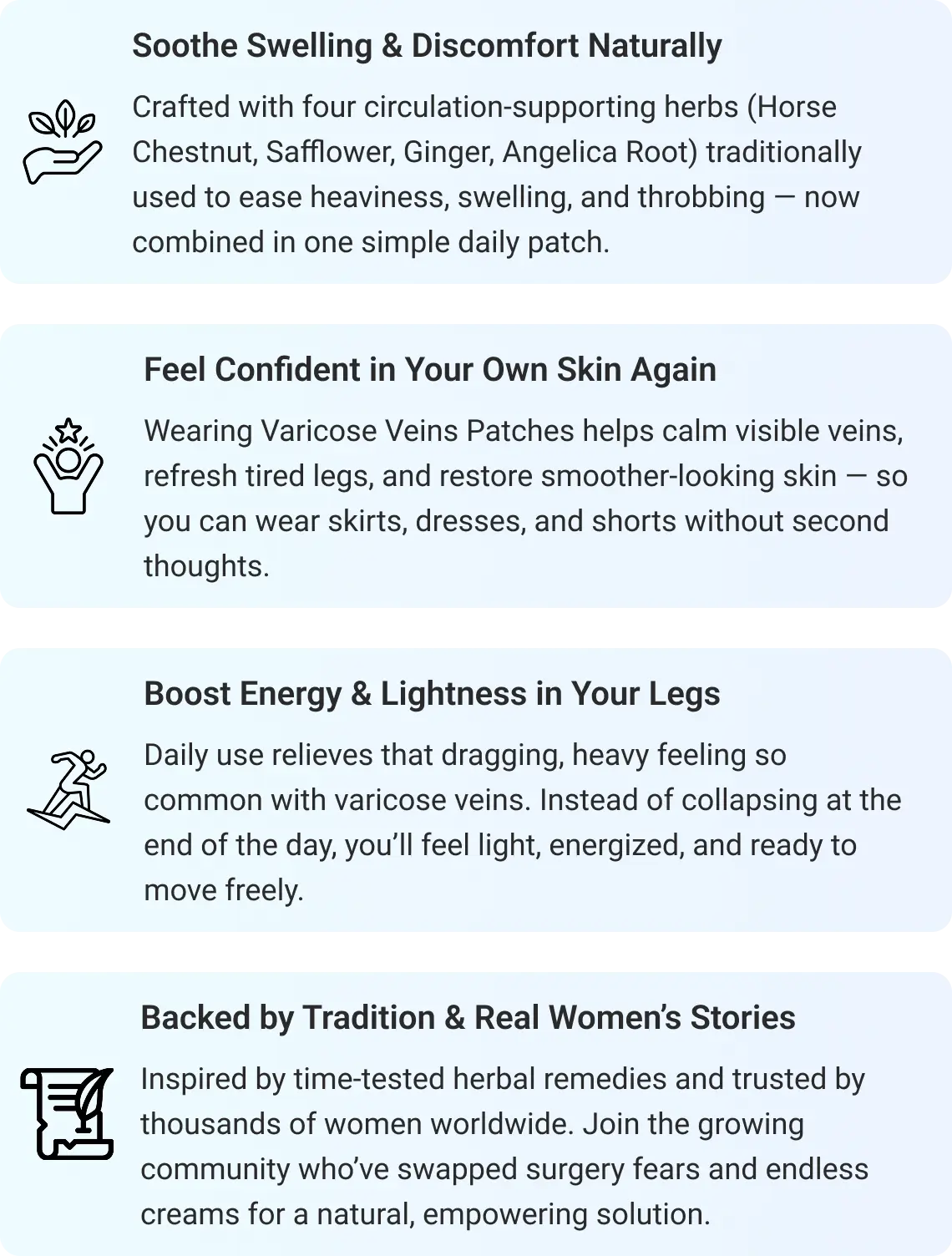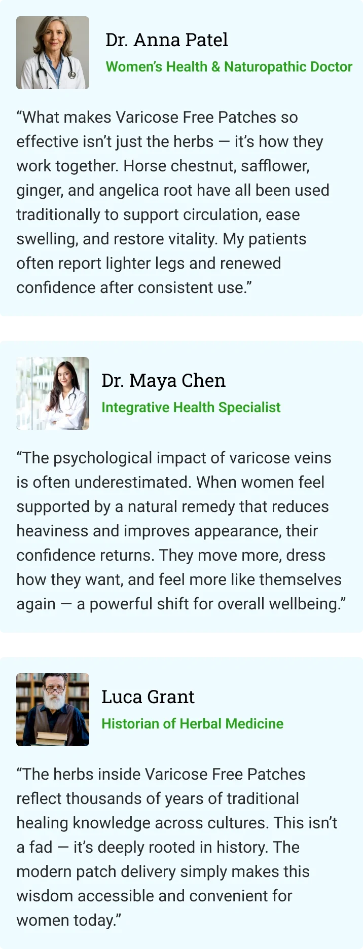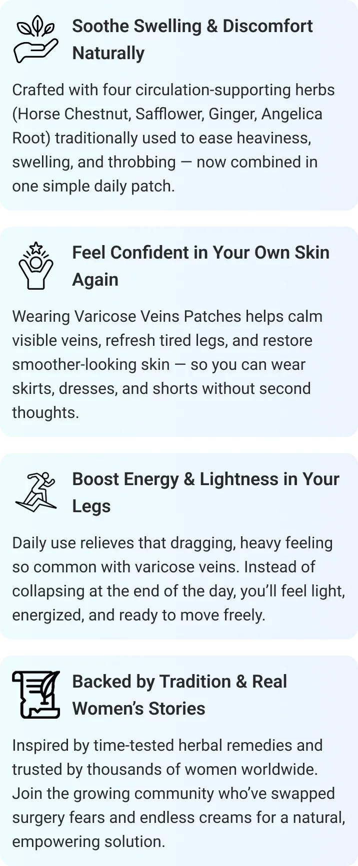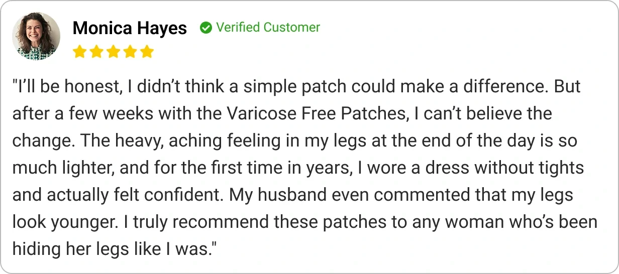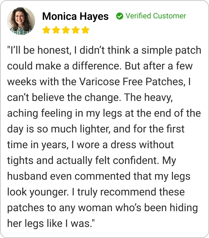 Varicose Free Patches are more than a natural remedy — they’re your key to transforming how you feel about your legs and yourself. Women who once dreaded slipping into shorts or avoided pool days now describe the freedom of confidently showing their legs without second thoughts. Many report soothing relief from swelling and heaviness, a visible softening of varicose veins, and a sense of youthfulness they thought was gone for good.