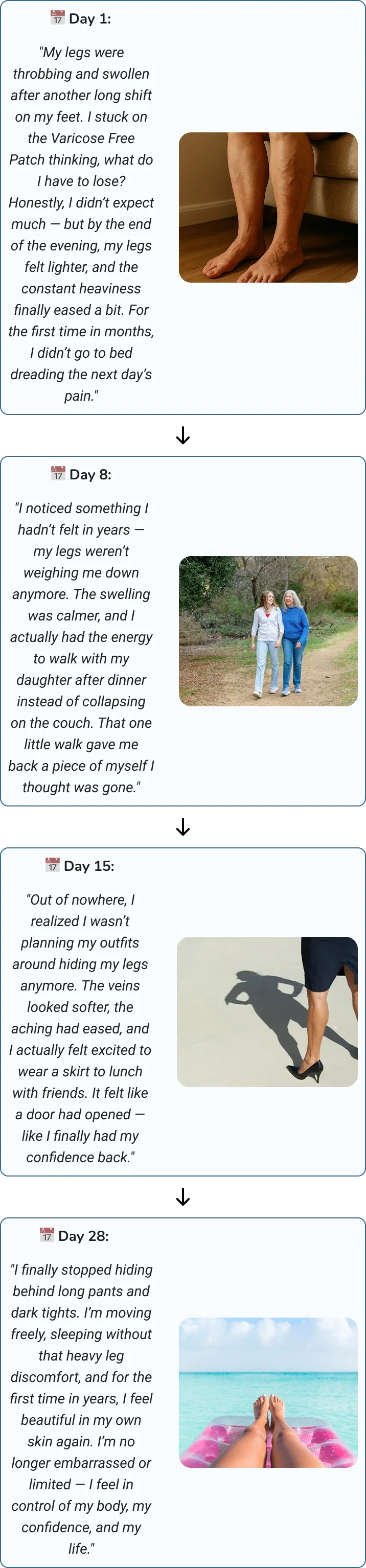 Simply apply the Varicose Free Patch to your legs each day — and feel your comfort, confidence, and freedom begin to return. Here’s how the transformation usually happens: